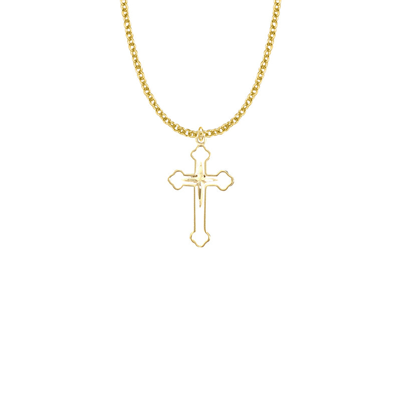 1-1/8 inch 14kt gold plated over sterling silver pierced and budded ends cross necklace on 18 inch stainless steel gold plated chain. The cross necklace has a inner 4 pointed cross. Includes an elegant deluxe velour jewelry box.