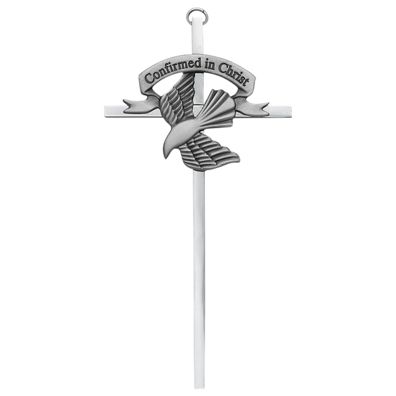 6-1/2 inch silver plated metal wall cross with centered pewter finish confirmation dove casting. Cross can be hanged with loop on top of cross. The centered casting has the engraved wording "Confirmed in Christ." Includes an elegant wall cross gift box.