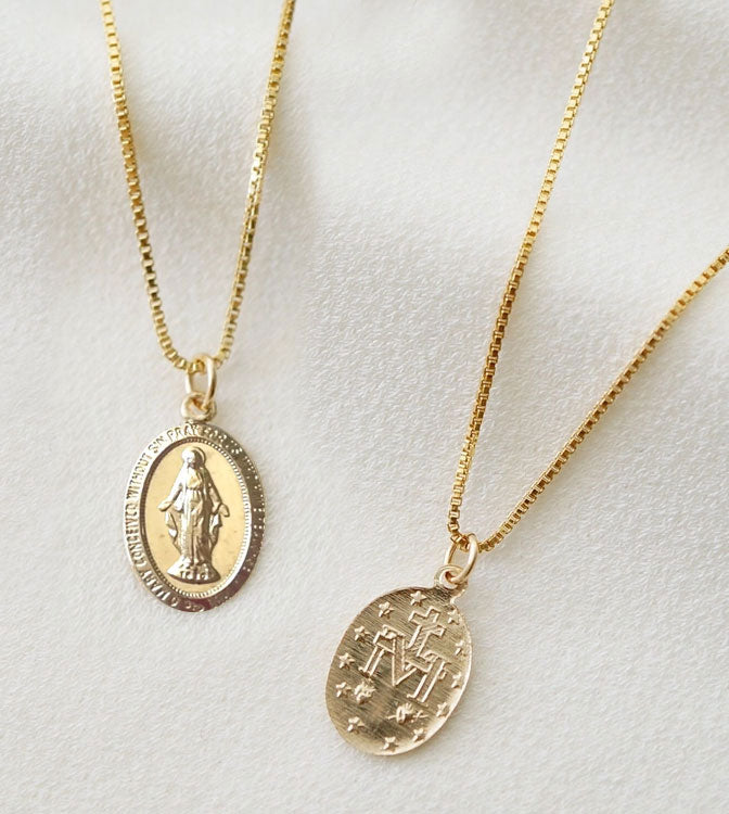 Our petite Blessed Mother Virgin Mary necklace is perfect for everyday, a little shimmering piece that looks amazing layered, or dainty on its own. Necklace and pendant are made of 14K gold fill.