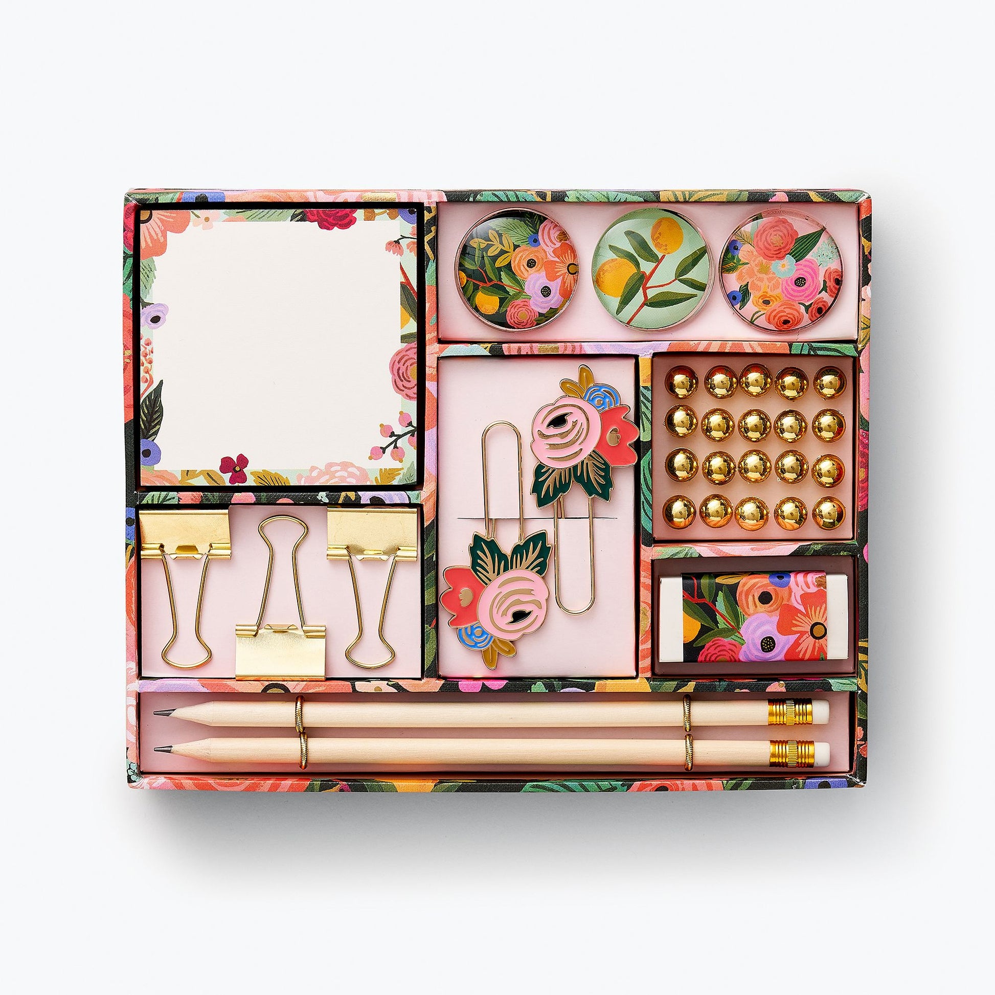 This tackle box includes all the little things you need to stay organized. The divided box is printed with the Garden Party floral pattern and comes filled with pencils, push pins, binder clips, paper clips, magnets and more. Created by Rifle Paper Co., a stationery and lifestyle brand based in Winter Park, Florida, founded in 2009 by husband-wife team Nathan and Anna Bond. Anna’s hand-painted illustrations and distinctive color palette are at the heart of the brand, and their thoughtfully designed line of stationery, home decor and gifts create moments of unexpected beauty in the real world.