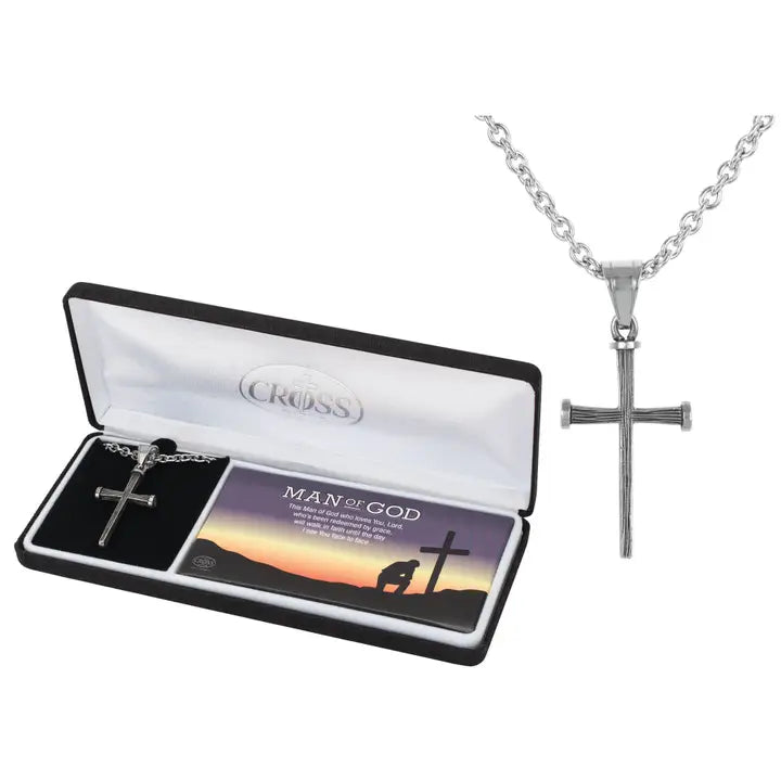 Man of God Men's Nail Cross Necklace Nail design cross has antique textured look and feel. Stainless steel cross is 11/4"L x 7/8"W on 3/8" bale. Stainless steel cable chain is 24". Deluxe black gift box has man and cross silhouette design the words Man of God and a short poem.